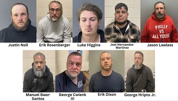 Arrested were George Cwienk III, 51; Joel Hernandez-Martinez, 36; George Hripto Jr., 50; Jason Lawless, 45, all of Bridgeport; Manuel Baez-Santos, 34, of Norristown; Erik Dixon, 33, of King of Prussia; Luke Higgins, 29, of Dauberville; Justin Noll, 34, of Reading; and Erik Rosenberger, 46, of East Greenville.